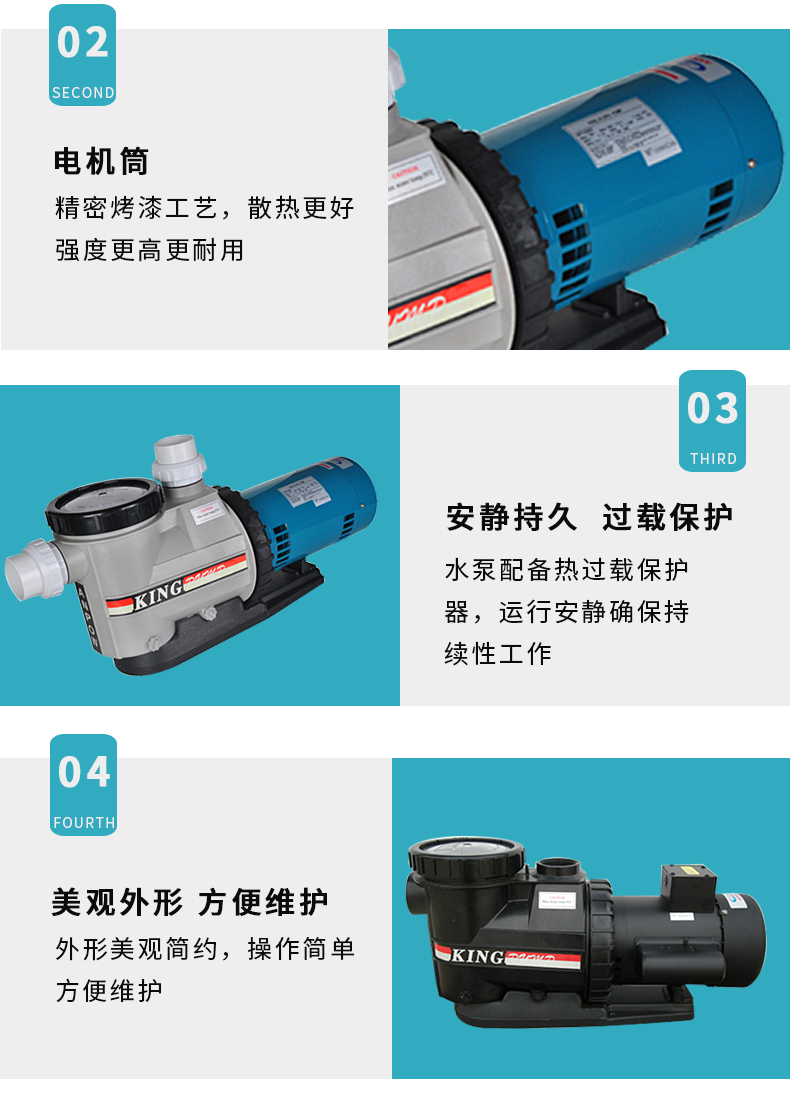 根據(jù)水力學原理設計的泵體,泵體、葉輪采用高強度工程塑料,經(jīng)久耐用。濾藍容量大,大大減少了清洗工作。性能好,效率高,加快了注水(灌溉)速度并提高了能源效率。適用于各種泳池、工業(yè)用水、海洋館、水上樂園等。